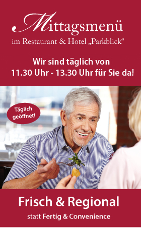 Besuchen Sie unser Restaurant & Café „Parkblick“ in der Seniorenresidenz und erleben Sie ein Mittagessen, das keine Wünsche offen lässt mit Vorspeise, Hauptgericht, Dessert, Salatbuffet und Tischgetränk inklusive.